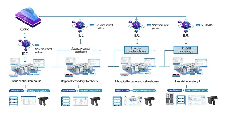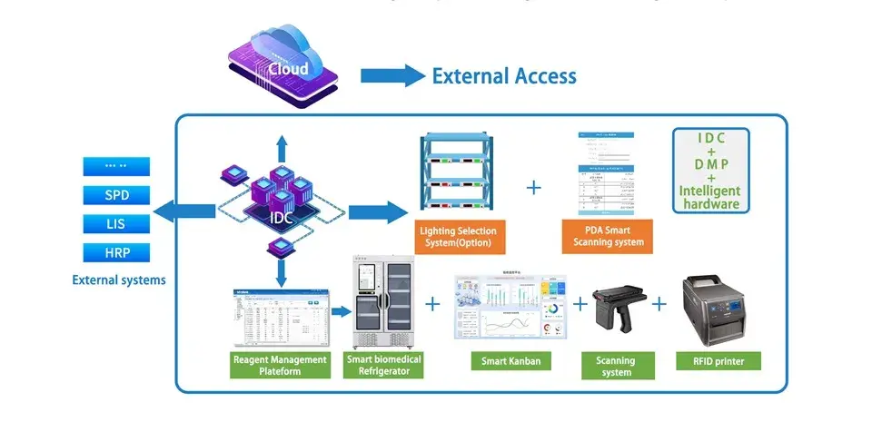 IVD IoT solutions achieves the coordination and consistency of reagent management inside and outside the hospital through the establishment of an IoT workstation in the hospital, centralized management and distribution of medical reagents outside the hospital, and refined management in the hospital. The solutions establishes a management platform including the specifications, varieties, prices, upper and lower limits of inventory, expiration date management, wastage, and efficiency of reagents. Through intelligent equipment such as smart refrigerators, visual Kanban, automatic replenishment, and verification terminals, it can meet the multi-level inventory management and personalized needs of the inspection department, and realize the easy traceability, high accuracy, low inventory, informationization and high efficiency of medical reagent management.